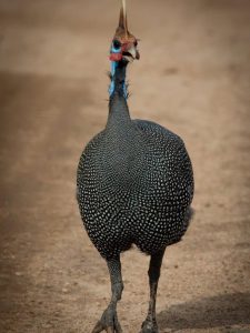 This African bird has been domesticated and can be found on farms throughout the world. They are easily identified by their dark feathers, adorned with white speckles, as well as the blue and red color of their head and helmet-like casque.