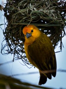 The Taveta Golden Weaver is named for the intricate nests in which they raise their young. Native to Western Africa, including Kenya and Tanzania, this male collects strips of grass and carefully interweaves the pieces to create a sturdy, rounded nest high in a tree. A colony of Weavers will typically build nests within the branches of the same tree. Females will fly from one nest to another and choose a mate based on the quality of their nest.