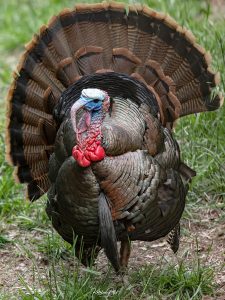 The North American Wild Turkey is adaptable to a variety of habitats including open forests, marshlands, and pastures. They spend their days foraging the ground for acorns, leaves, shoots, berries, insects, and even small vertebrates. At night, they roost among tree branches.